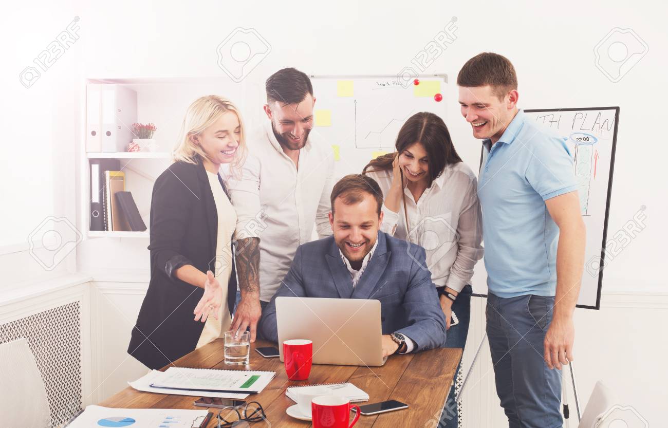 Scarica Gratis Les Gens D Affaires Heureux Rire Pres Ordinateur Portable Dans Le