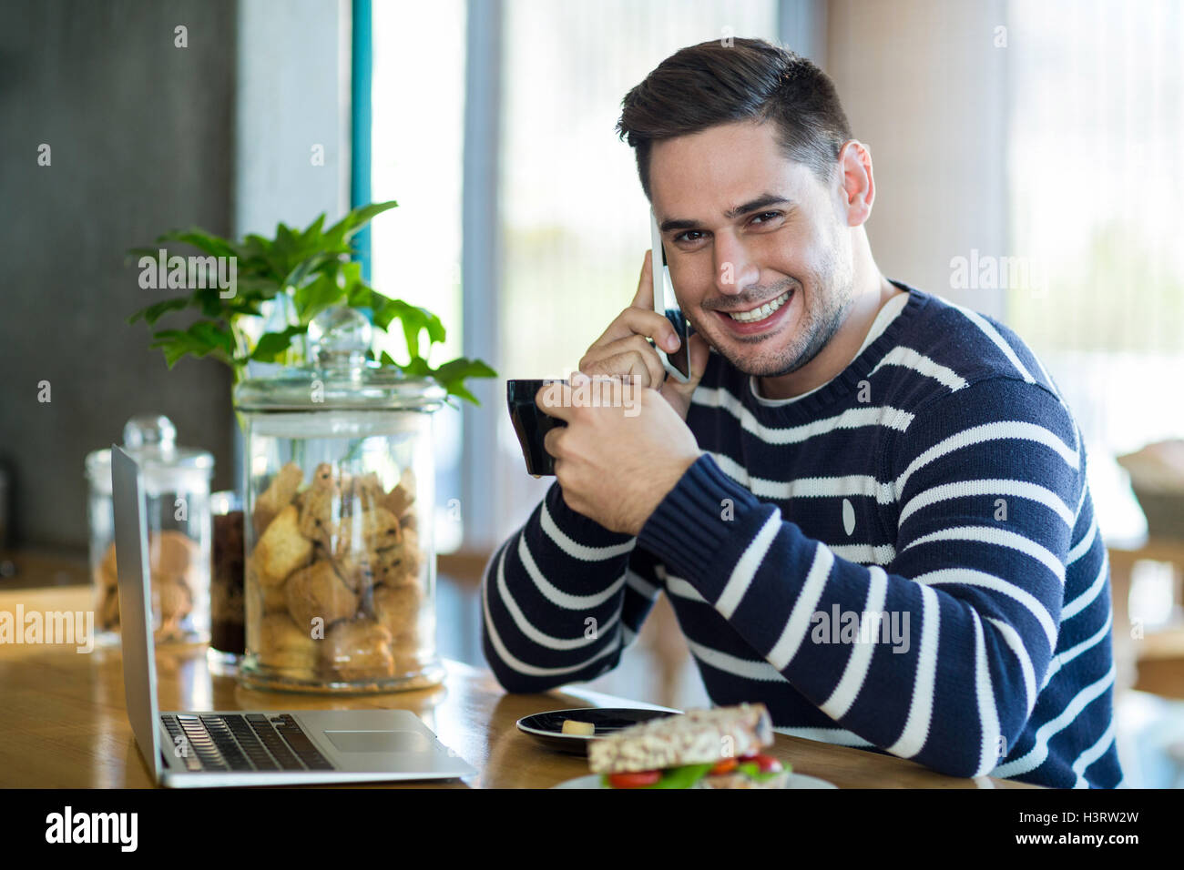 Scarica Gratis Smiling Waiter Leaning On Glass Door In Caf Stock Photo